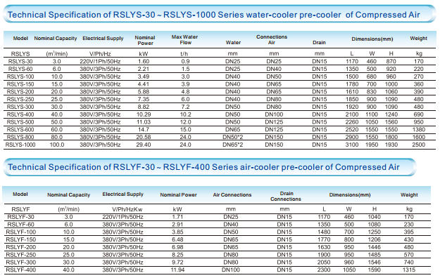 RSLYシリーズ空気予冷却機は、気液分離器分離プロセスを通してそして、気体水凝縮液の圧縮空気への冷却方法によるものである。